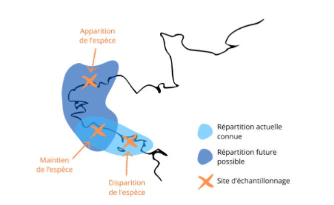 La répartition à large échelle de certaines espèces peut être modifiée à cause des changements climatiques. Des zones peuvent devenir moins favorables et on observera alors un déclin de ces espèces. D’autres zones au contraire, qui jusque-là n’étaient pas accessibles, présenteront des conditions plus accueillantes et pourraient voir arriver de nouveaux habitants. Par la modélisation, nous cherchons à reconstituer l’aire de répartition actuelle et la potentielle aire future en fonction des affinités climatiques des espèces.