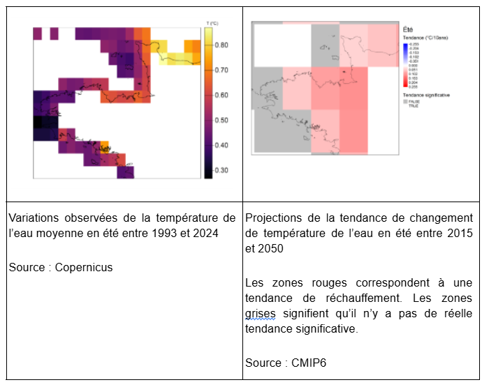 D’après ces cartes, en se basant uniquement sur le critère de température de l’eau, il faudrait idéalement des sites répartis dans des zones à fort changement (ex : entre la Baie du Mont St-Michel et la baie de St-Brieuc), moyen (ex : autour de la Côte de Granit Rose, Golfe du Morbihan), et faible (ex : pointe Finistère Sud).