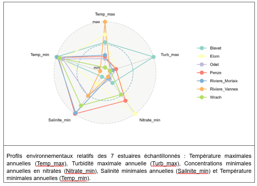 Au total, 10 estuaires qui ont été échantillonnés, dont 7 ont pu bénéficier d’une caractérisation suffisante à la fois de la physico-chimie de la masse d’eau et de la charge en nutriments, pour poursuivre les investigations. Comme le montre la figure suivante, les 7 estuaires décrivent des contextes environnementaux variés, ce qui est nécessaire pour être en capacité de démêler l’influence de la pollution des autres effets environnementaux.