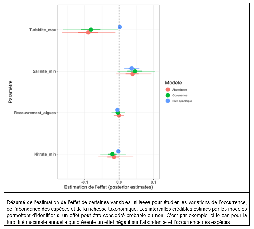 Pour déterminer comment les communautés de gastéropodes répondent aux différents contextes environnementaux, l’analyse des données a reposé sur l’utilisation de modèles statistiques. Ces approches visent à identifier des liens statistiques entre des variables dites « explicatives », dans notre cas les variables environnementales, et une ou plusieurs variables « à expliquer », c’est à dire descriptives de nos communautés : l’occurrence et l’abondance des espèces, ou encore la diversité des différentes espèces. Sans rentrer dans les détails, l’approche utilisée a permis à la fois d’évaluer la réponse spécifique de chacune des espèces de gastéropodes mais également de déterminer si une réponse homogène se dégage à l’échelle de l’ensemble de la communauté. Dans ce cadre, un impact (qu’il soit positif ou négatif) peut alors être considéré comme hautement probable si l’intervalle de l’effet estimé (intervalle crédible) n’inclut pas 0. En résumé, et comme le montre la figure suivante, aucun effet des nutriments n’a pu être pour le moment mis en évidence à l’échelle de la communauté quel que soit le paramètre de communauté utilisé (l’abondance, l’occurrence des espèces ou la richesse spécifique).